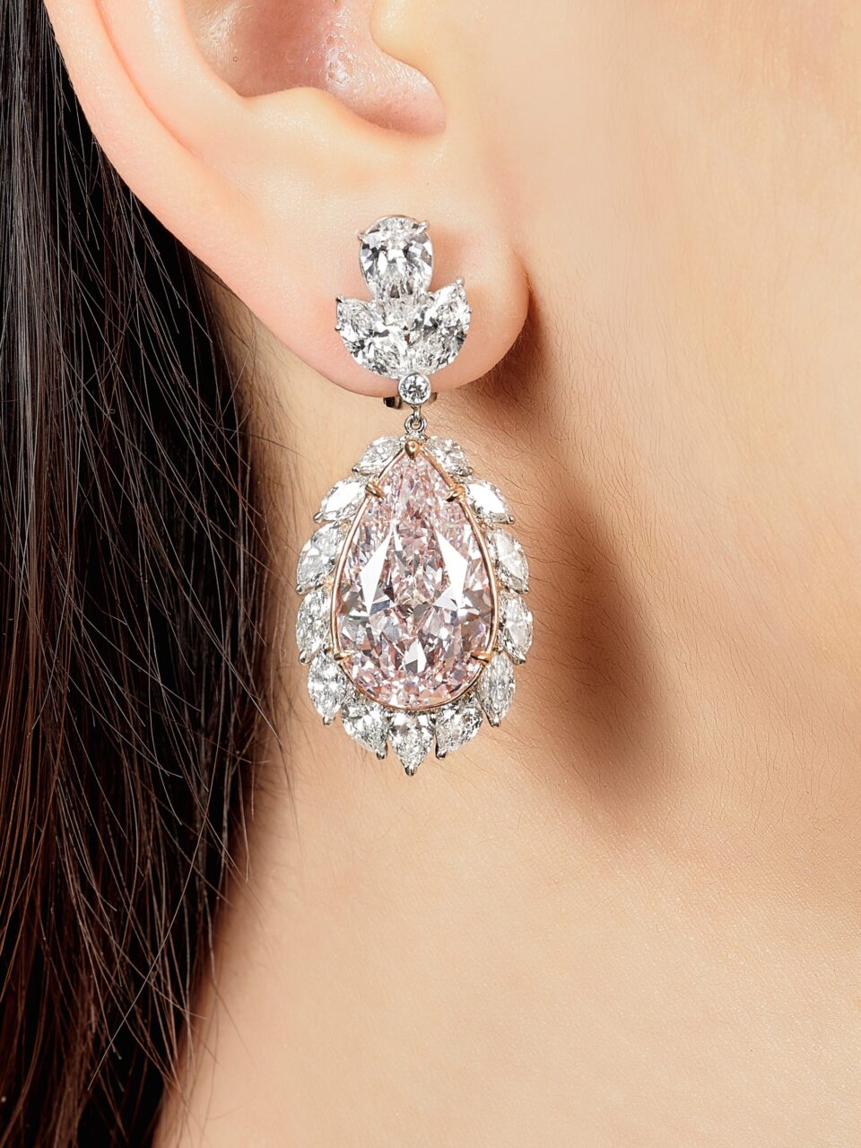 2023年4月的蘇富比「瑰麗珠寶 I 」拍賣的焦點,就是這雙分別以11.17卡和 10.85卡的巨型彩粉紅色鑽石為主石,周邊鑲嵌大量欖尖形和梨形鑽石的耳環,色調甜美的梨形粉紅鑽石配合大量閃爍鑽石,散發柔和而迷人的光芒,宛如一場視覺盛宴。