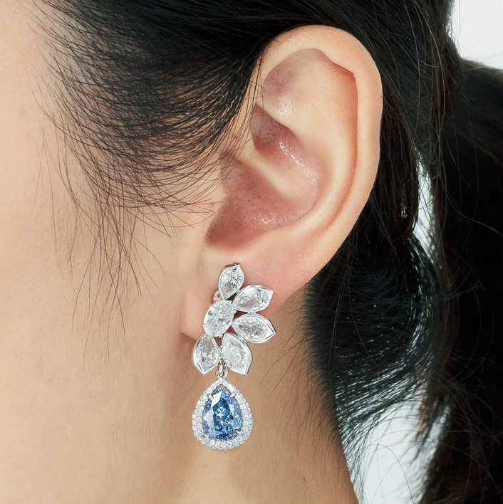 2021年11月的佳士得「瑰麗珠寶及翡翠首飾」拍賣會上,這對淺藍鑽石耳環成為了該拍賣會的成交冠軍,耳環採用罕見的淺藍色梨形鑽石為主石,分別為3.06及2.61卡的艷彩藍色鑽石色澤清澈如水,温柔而富有優雅魅力,搭配周邊緊密鑲嵌的精緻白鑽,以及如同盛放花瓣的獨特設計,完美展現珠寶設計的創意與工藝。